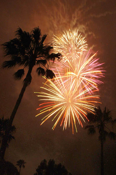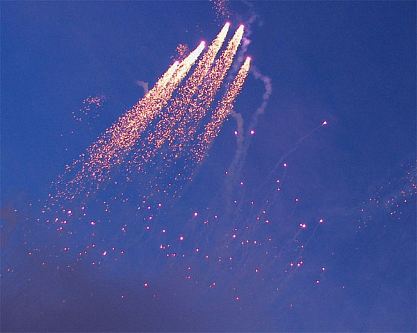 exposure of about 3 seconds of fireworks. Ektachrome 100 film. July Mid