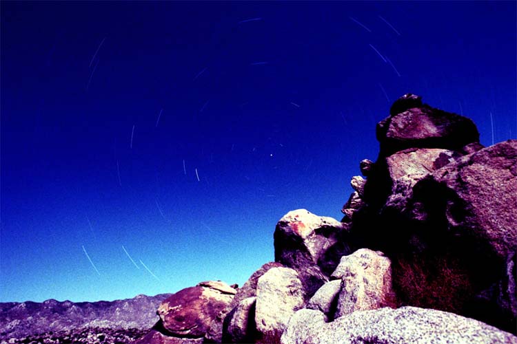 of a rock outcropping was shot with a super-wide angle lens. The rocks appears as mountains although they were 2 feet high. 8 minute exposure at