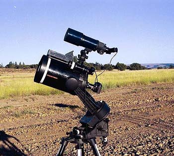Here is what obsession can lead to. The main telescope is a Celestron 8" on an equatorial clock driven mount. My Minolta X700 camera is attached to it on the back. The scope on top is used to track a guide star and make fine adjustments to the tracking during exposures. The black box thing on top is a telrad and is used for locating objects. The smaller scope on the side is also a finder scope. Sitting below out of the photo is the main control box, hand controls and battery