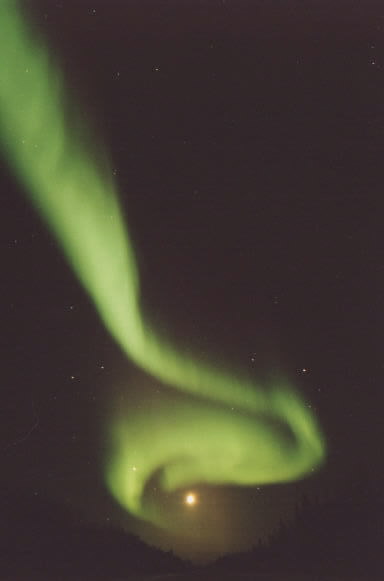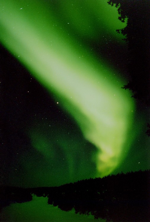 This photo of an aurora corona was taken at Hutch Lake near High Level, Alberta on 3/9/04. Photo details: Fuji 800, 24 mm, f 1.8, exposed for 30 seconds. See more photos by: John Sandy - Deer Park, Washington |