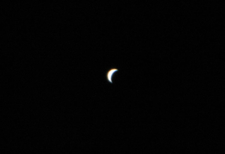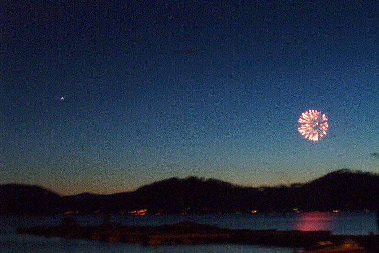 Venus during sunset over Portage Lake in Pinckney, Michigan."The orange stripe going 4/5 the way across the photo from left to right is the running lights on a pontoon boat crossing the lake." Pentax 35mm on Kodak Royal Gold 400 color print film. 30 sec exp e-mail to: Mike Hutchinson - Muncie, Indiana |