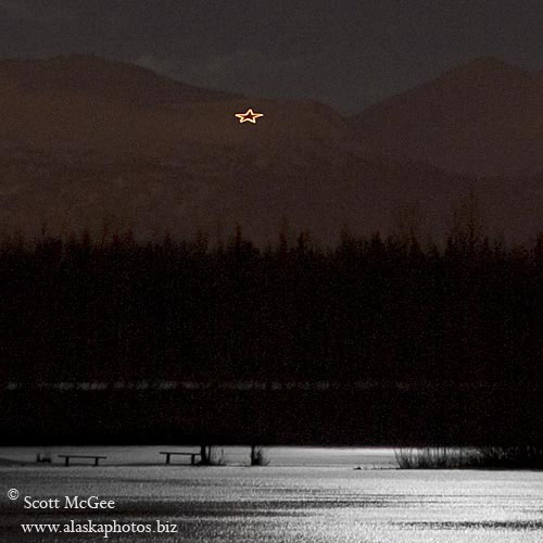 from nearly everywhere in Anchorage.I've also included a second photo that is a close-up crop of the overall photo. It clearly shows the star and the moonlight shining on the frozen surface of the lake. See more photos by: Scott McGee - Anchorage, Alaska |