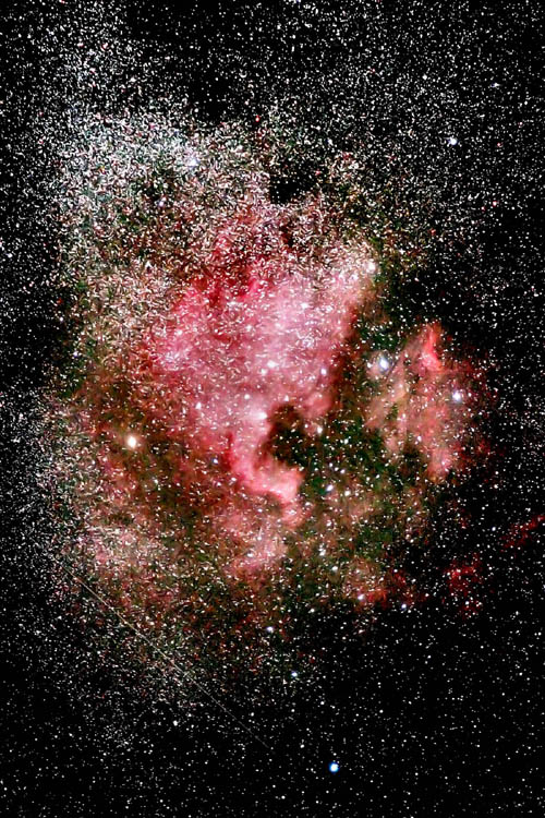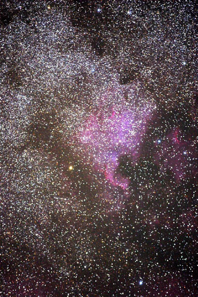 NGC700021 copy.jpg (114205 bytes)NGC7000  [the north american nebula] Taken with my 200mm 400mm tamron. 2 pictures combined. One four and one five minute exposure at 1600ASA   Taken at St-Elzéard Québec