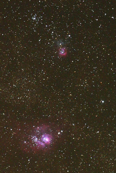 m8m2012juin1 copy.jpg (61823 bytes)M8 & M20 [the lagoon and trifid nebulas]  Taken with my 200mm 400mm tamron. Exposed four minutes at 1600ASA. Taken with my digital rebel camera at St-Elzéard Québec